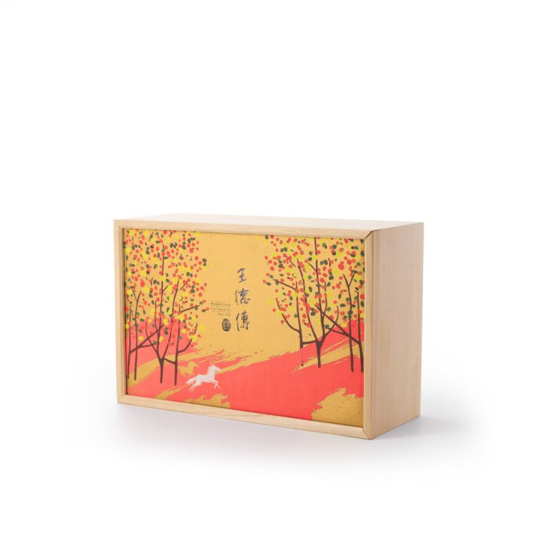 梧桐木抽屜禮盒,絹布盒蓋結合絲網與燙金工藝,質感金光閃耀細緻。馳澄禮盒以德傳經典紅色茶罐,獻上兩款輕重口感的臺灣好茶。